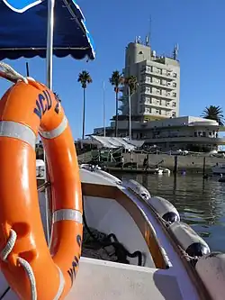 In 1906, a group of young sailors founded the Uruguayan Yacht Club in Montevideo's bay in order to promote sailing in the region.[1] Years later the club moved to Buceo's bay and in 1939 the club consolidated its presence with the construction of an eight-story building. Architects Jorge Herrán and Luis Crespi designed the boat-shaped building which, since 1997, has been considered part of Uruguay's historical legacy.[2] Late in the 20th century, the yacht club incorporated branches in Punta del Este and Santiago Vázquez.