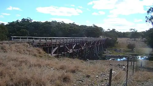 Only two other such timber viaducts were built in this period, the Ingalara Creek railway bridge and the Bredbo River railway bridge on the Bombala railway line.[1]