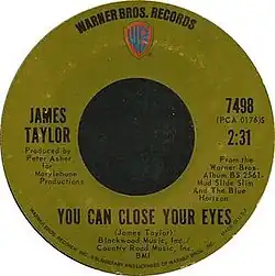"You Can Close Your Eyes" is a song written by James Taylor which was released on his third studio album Mud Slide Slim and the Blue Horizon (1971). It was also released as the B-side to his #1 single "You've Got a Friend". It has often been described as a lullaby. It was initially recorded and released by his sister Kate Taylor for her 1971 album Sister Kate. The song has been covered by many artists, including Carly Simon, Linda Ronstadt, Maureen McGovern, Richie Havens, Sheryl Crow, Sting, Eddie Vedder with Natalie Maines, and the King's Singers.