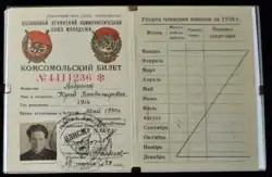 Komsomol membership card issued to Yuri Andropov in 1939.